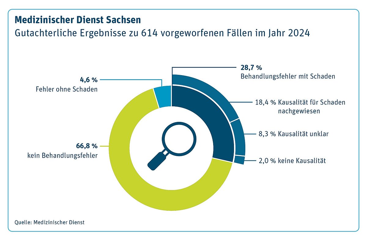 In jedem dritten Fall (28,7 Prozent) bestätigten die Gutachterinnen und Gutachter des Medizinischen Dienstes Sachsen einen Behandlungsfehler mit Schaden. In 18,4 Prozent war der Fehler ursächlich für den erlittenen Schaden der Patientinnen und Patienten. In 66,8 Prozent lag kein Behandlungsfehler vor. Behandlungsfehler kommen in allen Fachgebieten vor: Das Spektrum reicht von Allgemeinmedizin über Orthopädie und Unfallchirurgie, Gynäkologie, Viszeralchirurgie bis hin zur Zahnmedizin.